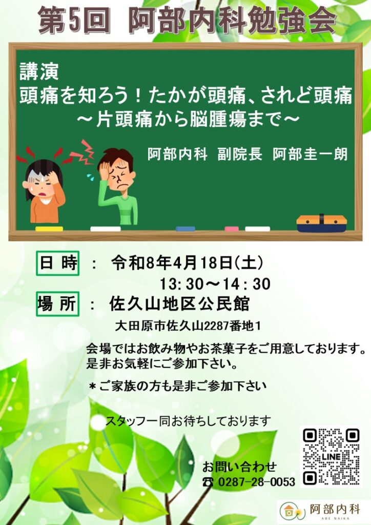 今回は日本頭痛学会の会員でもあります副院長が頭痛の種類、頭痛を来たす疾患、予防策、治療、当院での取り組みについて徹底解説します。お時間ございましたら是非ご参加下さい。
